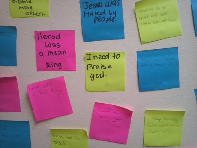 Each time you teach, read as much as possible straight from the Bible. Place a picture depicting the story on the board and ask the children to respond using post-it notes. Add more each week to use for review. For example: